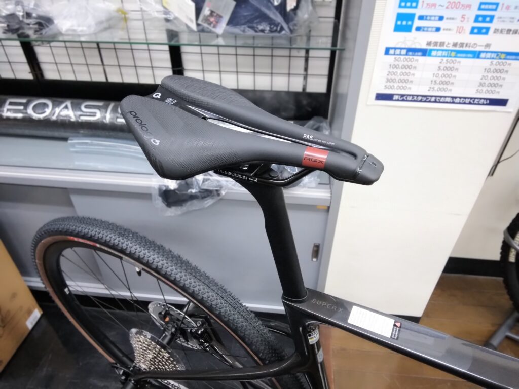 サドルはグリップ力の高いプロロゴのディメンションAGX STN。シートポストはカーボン製。