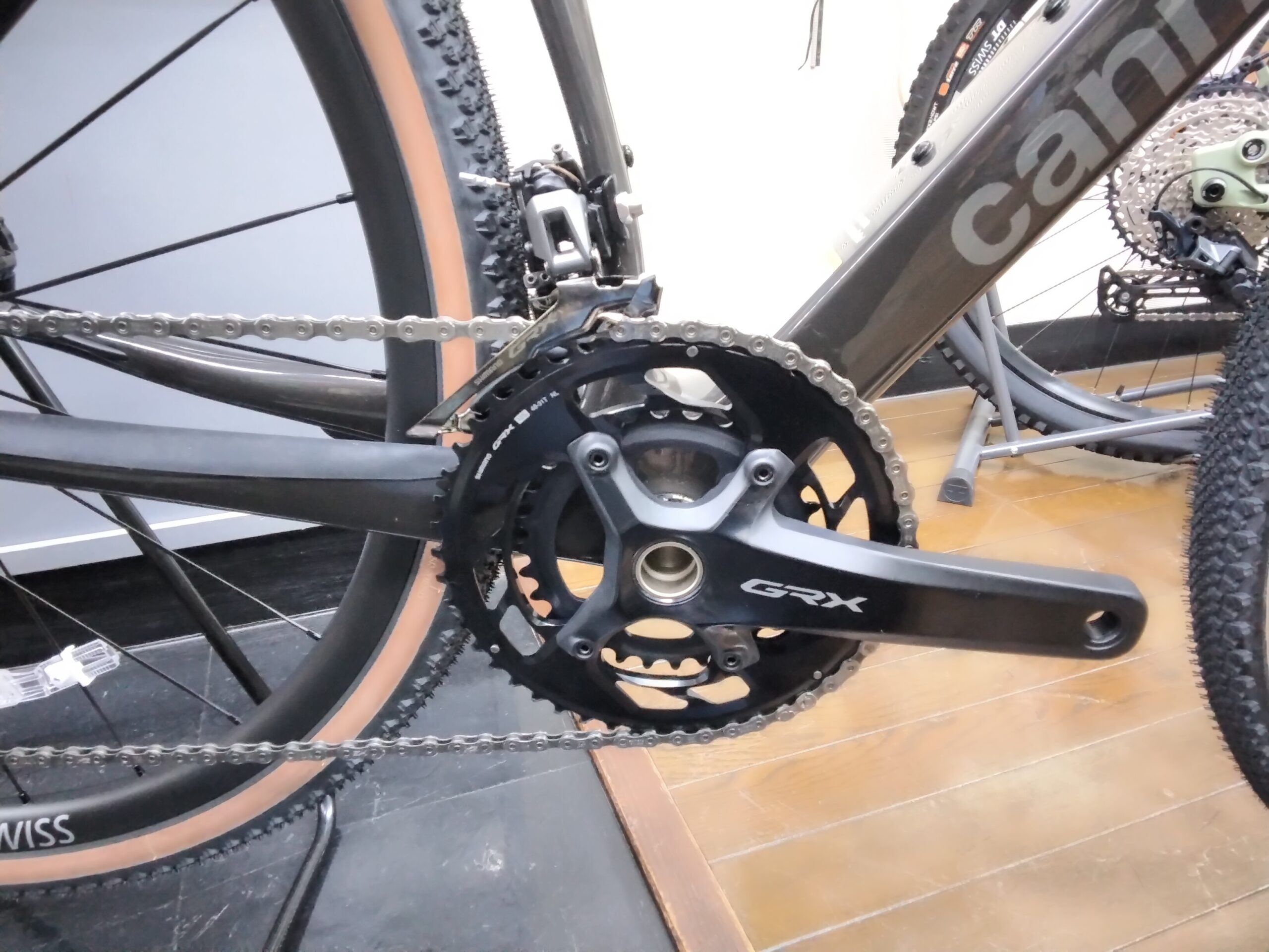 フロントドライブトレインはシマノGRX820のクランクとフロントディレーラーのダブル仕様。